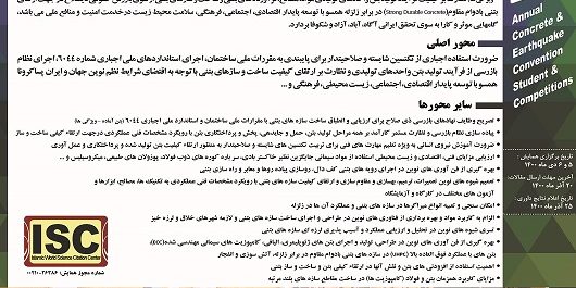 محور اصلی همایش: ضرورت استفاده اجباری از تکنسین شایسته و صلاحیتدار برای پایبندی به مقررات ملی ساختمان، اجرای استانداردهای ملی اجباری شماره 6044، اجرای نظام بازرسی از فرآیند تولید بتن واحدهای تولیدی و نظارت بر ارتقای کیفیت ساخت و سازهای بتنی با توجه به اقتضای شرایط نظم نوین جهان و ایران پساکرونا همسو با توسعه پایدار اقتصادی، اجتماعی، زیست محیطی، فرهنگی و …